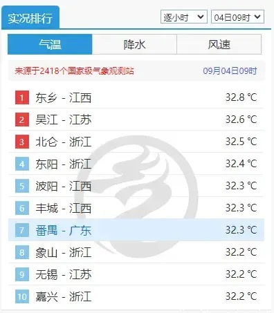 汕尾、番禺、东莞、珠海的气温齐刷刷30℃+