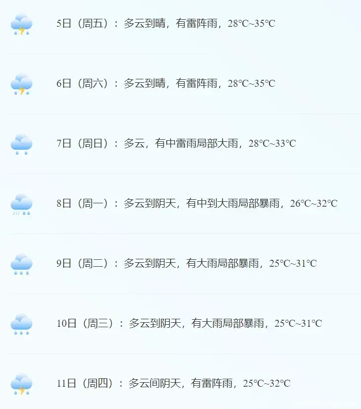 5日,珠江三角洲、粤西、河源和韶关市县多云,有(雷)阵雨局部大雨或暴雨,其余市县多云,局部有(雷)阵雨。最高气温:南部沿海市县30℃~33℃,其余市县34℃~37℃。